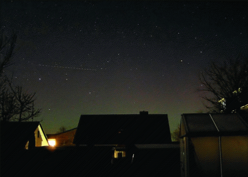 Zu den Aufnahmedaten: Digitale Kompaktkamera Minolta Dimage Z1, 30 Sek. Belichtung bei ISO 400 und Blende F2,8. Das Bild ist nachträglich etwas entrauscht und leicht in Kontrast und Helligkeit korrigiert. Die Blickrichtung war genau Nord, Uhrzeit 23:16 Uhr.