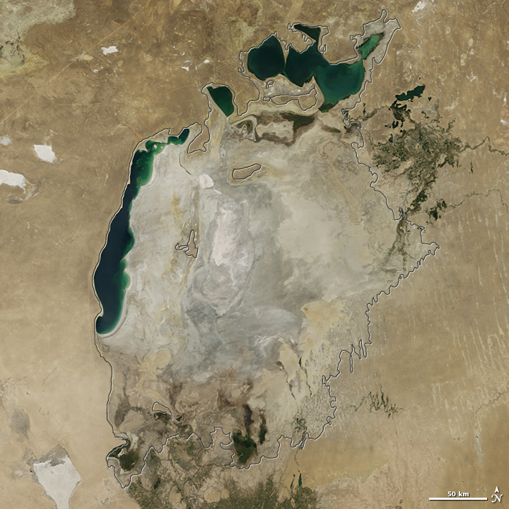 Allgemeines über den Aralsee: Der Aralsee war einstmals mit einer Fläche von etwa 68.000 Quadratkilometern der viertgrößte See der Erde. Seit 1960 schrumpft er deutlich und inzwischen sind nur noch Bruchteile der ursprünglichen Wasserfläche vorhanden. Die Austrocknung des abflusslosen Aralsees gehört zu den schlimmsten Umweltkatastrophen weltweit. Übrig sind heutzutage nur noch der kleine und durch künstliche Dämme abgeschottete Nordteil des Sees sowie winzige Reste des Südteils. Ausgelöst wurde die derzeitige Austrocknung durch die weitgehende Umleitung der beiden Hauptzuflüsse Amudarja und Syrdarja, um das trockene Land um den See landwirtschaftlich nutzen zu können. Die Auswirkungen auf die Umwelt und die regionale Wirtschaft sind gewaltig. So liegen ehemalige Hafenstädte und Badeorte nun mitten im Land. Der See befindet sich östlich des Kaspischen Meers im Gebiet der Staaten Kasachstan und Usbekistan. In der Region herrscht kontinentales Halbwüsten- und Wüstenklima mit nur geringn Niederschlagsmengen. Untersuchungen haben gezeigt, dass der Wasserspiegel des Aralsees zusätzlich enormen natürlichen Schwankungen unterliegt. Siedlungsreste zum Beispiel aus dem 13. Jahrhundert deuten auf ähnlich niedrige Wasserstände hin wie heute. Allerdings ist der aktuelle Rückgang größtenteils auf die Wasserentnahme zurückzuführen. Mit dem Dammbau zur Rettung des Nordteils des Sees und der damit weiter verringerten Wasserzufuhr zum Südteil wurde dieser praktisch aufgegeben. Allgemeine Links: Aralsee (Wikipedia) Evaporation of the Aral Sea (NASA, 19.08.00) Meldungen zum Aralsee: Rettung des Aralsees soll weitergehen (Spektrum.de, 10.04.07) Der Aralsee verschwindet (n-tv, 06.11.09) Aralsee verliert seinen Ostflügel (Spektrum.de, 26.09.14) Aralsee nahezu vollständig ausgetrocknet (n-tv, 01.10.14) Erschreckende Bilder der NASA zeigen Austrocknung des Aralsees (n-tv, 25.01.16) Im Aralsee liegt eine mysteriöse Insel (n-tv, 04.01.18) Umweltkatastrophe treibt Touristen zur Aralsee-Wüste (n-tv, 14.09.19) Aralsee von Staub bedeckt (Unwetteragentur, 02.04.20) Am Aralsee spielt sich eine Katastrophe ab (n-tv, 02.01.22) Staubige Ruinen erinnern an Aralsee-Katastrophe (n-tv, 31.03.24) Dunes and Desert Replace the Aral Sea (NASA, 02.06.24) Veränderung des Aralsees: Shrinking Aral Sea 2000 - 2015 (NASA) Weitere Satellitenbilder des Aralsees: The Shrinking Aral Sea (NASA, 05.05.01) "Rebirth" Island Joins the Mainland (NASA, 25.08.01) Windswept Shores of the Aral Sea (NASA, 27.03.03) Aral Sea (NASA, 25.08.03) Retreating Aral Sea Coastlines (NASA, 14.08.05) Aral Sea Expansion (NASA, 14.04.06) North Aral Sea Recovery (NASA, 03.05.07) Dust Storm over the South Aral Sea (NASA, 09.05.07) Dust Storm over the Aral Sea (NASA, 01.04.08) Dust Storm over the Aral Sea (NASA, 29.04.08) Aral Sea, 2000-2008 (NASA, 25.08.08) Dust Over the Aral Sea (NASA, 20.05.09) Aral Sea Continues to Shrink, August 2009 (NASA, 27.08.09) Snow around the Aral Sea (NASA, 08.01.10) Aral Sea Dust Storm (NASA, 26.03.10) The Shrinking Aral Sea Recovers (NASA, 30.10.10) Syr Darya River Floodplain, Kazakhstan, Central Asia (NASA, 01.11.10) Aral Sea 2011 (NASA, 11.09.11) The Aral Sea, Before the Streams Ran Dry (NASA, 24.02.12) The Aral Sea Loses Its Eastern Lobe (NASA, 26.09.14) New Water in the Aral Sea (NASA, 01.09.17) A Dusty Day Over the Aral Sea (NASA, 26.03.20) Aral Sea in Winter (NASA, 03.01.21) Andere schrumpfende Seen: Es gib weltweit einige andere Seen mit derzeit deutlich sinkenden Wasserständen, allerdings nicht so extrem wie beim Aralsee. Dazu gehören unter anderem das Tote Meer im Nahen Osten und der Lake Orumiyeh im Iran. Auch der durch den Hooverdamm aufgestaute Colorado River im Westen der USA schrumpft erheblich wegen der enormen Wasserentnahme für die Spielerstadt Las Vegas in der Wüste von Nevada. Lake Orumiyeh, Iran (NASA, 09.11.11) The Dead Sea (NASA, 06.04.12) China: Shrinking Lake Ebinur (NASA, 25.11.14) Lake Chad and a Bodele Dust Plume (NASA, 30.03.15) Shrinking Lakes on the Mongolian Plateau (NASA, 08.04.15) USA: Goose Lake Dries Up (NASA, 12.08.15) Losses in Lake Mead (NASA, 18.08.15) Afrika: The Decline of Lake Kariba (NASA, 12.02.16) Tasmanian energy crisis: Lake Gordon dam level fall captured in dramatic video (ABC Australia, 31.03.16) The Ups and Downs of Lake Chad (NASA, 25.11.17) Disappearing Walker Lake (NASA, 04.04.18) Reviving the Shriveled Lake Urmia (NASA, 22.04.19) Argentinien: The Comings and Goings of Lakes (NASA, 24.04.19) Water Levels Keep Falling at Lake Kariba (NASA, 31.12.19) Tschad: Remnants of an Ancient Lake (NASA, 17.02.20) Another Dusty Day in Chad, 21.01.21 Record Low for Great Salt Lake, 18.08.21 Disappearing Lake Tuz (Turkey), 16.12.21 Two Decades of Change at Toshka Lakes (Ägypten) (18.01.22) Lake Mead: Austrocknender See bei Las Vegas gibt Leiche frei (n-tv, 03.05.22) Chilenische Seen verwandeln sich in Wüsten (n-tv, 21.07.22) Mexico: A Reservoir Runs Dry (23.07.22) USA: The Great Shrinking Lake (12.08.22) USA: Lake Powell Still Shrinking (24.08.22) The Caspian Sea’s Shrinking Coastline (NASA, 08.10.22) Shrinking Lake Abert (Oregon, USA) (NASA, 27.01.23) Africa: Low Water Level on Lake Kariba (NASA, 14.03.23) Return of Tulare Lake in California (NASA, 04.04.23) Iran: Lake Urmia Shrivels Again (NASA, 10.10.23) Death Valley: Floodwaters Fill Badwater Basin (NASA, 09.11.23) Lake Chad’s Water, Wetlands, and Dunes (NASA, 09.06.25) Lake Poopo in Bolivien: Lake Poopo Water Levels (NASA, 24.04.06) Lake Poopo, Bolivia's 2nd-largest lake, dries up (CBC, 18.12.15) Bolivia’s Lake Poopó Disappears (NASA, 15.01.16) Bolivia’s Lake Poopó Disappears (NASA, 23.01.16) Ansteigende Seen: Devils Lake, USA - Ein See läuft über (Spektrum.de, 30.04.12) Lake Victoria’s Rising Waters (NASA, 10.06.21) Badwater im Death Valley: Badwater Basin Refills (NASA, 08.02.24) Badwater-Senke im Death Valley wird zum See (n-tv, 26.02.24) |
