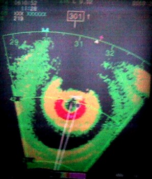 ![]() Zugbahnkarte von Unisys ![]() Zugbahn / Vorhersage (Underground) ![]() Radarbild der Hurricane Hunters Das Radarbild der Hurricane Hunter zeigt das zeitweise sehr kleine Auge von "Wilma" mit einem Durchmesser von nur 3 bis 4 km, umgeben von der eyewall und dem Graben, um das sich die äußeren Regenbänder spiralförmig anordnen. ![]() Wilmas Auge 21.10.05 (NASA) |