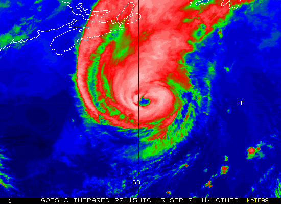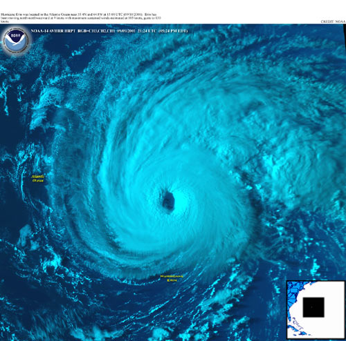 ![]() Zugbahn von Moreweather | Der Hurrikan ERIN war ursprünglich am 01./02. September auf dem offenen Atlantik entstanden. Der Sturm schwächte sich am 05. September durch starke Höhenwinde vorübergehend zu einer Tropischen Depression ab. Nur einen Tag später formierte er sich neu, am 07. September erreichte er wieder Sturmstärke und wurde am Tag darauf zum ersten Hurrikan dieser Atlantik-Saison. Am 09. und 10. September war ERIN sogar ein Sturm der Kategorie 3 auf der fünfteiligen Hurrikan-Skala mit Windgeschwindigkeiten bis 195 km/h. Dabei streifte er Bermuda mit heftigen Windböen und starken Regenfällen. Der Hurrikan ERIN zog dann nach Norden bis Nordosten. Am Samstag, 15. September, wandelte er sich bei Neufundland in ein Tief der mittleren Breiten um, war dabei aber noch sehr stark mit Windgeschwindigkeiten bis 110 km/h. Heftige Regenfälle gingen auf Novia Scotia und Neufundland nieder. Danach zog das außertropische Tief nach Gränland weiter. |