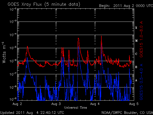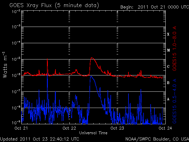 No.08/2011: 24./25. Oktober 2011 | Nach einem starken und lang dauernden Ausbruch vom 22. Oktober 2011 auf der Sonne machte sich ein coronaler Massenauswurf auf den Weg in Richtung Erde. Die zugehörige Schockfront erreichten am Abend des 24. Oktober gegen 19:49 Uhr MESZ den ACE-Satelliten und wenig später auch das Erdmagnetfeld. In der Nacht zum 25.10. konnte im Norden und in der Mitte Deutschlands gebietsweise Polarlicht beobachtet werden. Links zu den Sonnenstürmen: helles Polarlicht am 24/25.10.2011 (Polarlicht-Forum) Links zu Fotos und Sichtungen der Polarlichter: Grünberg, Mittelhessen, Zeitraffer von Jonas Piontek (YouTube) Beobachtung in Riesa, Sachsen (Sternwarte Riesa e.V. Polarlichter weltweit: October 2011 Aurora Gallery (SpaceWeather.com) |