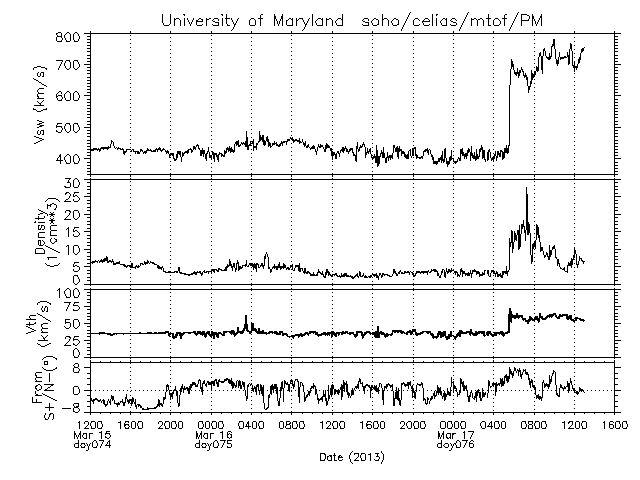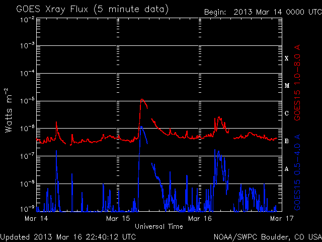 No.03/2013: 17./18. März 2013 | Nach einem recht starken Ausbruch der Stärke M1.2 vom 15. März 2013 (Start: 06:42 UTC, Maximum: 07:03 UTC, Ende: ca. 07:50 UTC) im Bereich der Sonnenfleckengruppe 11692 machte sich ein coronaler Massenauswurf (CME) auf den Weg ins Weltall. Es handelte sich um einen direkt erdgerichteten Auswurf. Die zum CME gehörige, ausgeprägte Schockfront erreichte am 17. März, 05:29 UTC (= 06:29 MEZ) den ACE-Satelliten und wenig später auch das Erdmagnetfeld. Sie traf damit für Europa zu einem sehr ungünstigen Zeitpunkt am frühen Morgen ein. Der Sturm hielt bis in die nachfolgende Nacht an. Bei sehr schlechten Wetterbedingungen liegen bisher keine Meldungen über Polarlichter in Mitteleuropa am Abend und in der Nacht vom 17. zum 18. März vor. Lediglich eine Webcam auf Rügen zeigte am Abend Polarlichter. Links zum Sonnensturm und zum Polarlicht: Langer M1.x@0700UT (Polarlicht-Forum) POLARLICHTVORWARNUNG - 1.1 EARLY WATCH 16./17.3.2013 (Polarlicht-Forum) |