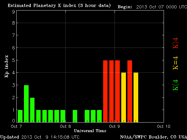 No.06/2013: 08. Oktober 2013 ![]() © by Andreas Möller | Am Nachmittag des 08. Oktober erreichte die Schockfront eines coronalen Massenauswurfs (CME) das Erdmagnetfeld. Am Abend gab es im Norden Deutschlands das 5. Polarlichtereignis des Jahres 2013. Allerdings war der Himmel fast überall bedeckt und es liegen nur vereinzelte Sichtungsmeldungen vor. Dazu noch die Grafik mit dem Kp-Index. Links zum Sonnensturm und zum Polarlichtereignis: Polarlicht-Sichtungen 08.10.2013 19:30 UT (Polarlicht-Forum) |