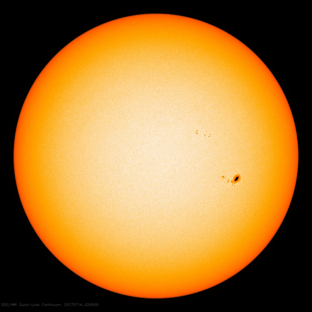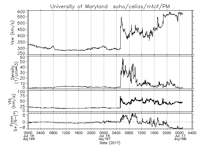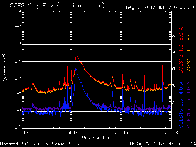 No.13/2017: 16./17. Juli 2017 | Nach einem starken und lang andauernden Ausbruch der Stärke M2.4 vom 17. Juli 2017 im Bereich der Sonnenfleckengruppe 2665 machte sich ein coronaler Massenauswurf (CME) auf den Weg ins Weltall. Die Fleckengruppe befand sich etwas westlich der Mitte der sichtbaren Sonnenscheibe, das Aufleuchten während des Ausbruchs war auf den betreffenden Satellitenbildern deutlich zu sehen. Die zum CME gehörige Schockfront traf am Morgen des 17.07. auf den vorgelagerten ACE-Satelliten und erreichte kurz danach das Erdmagnetfeld. Am Abend und in der darauf folgenden Nacht wurden allerdings nur vereinzelt fotografisch nachweisbare Polarlichter beobachtet. Hier noch der Kp-Index zu dem starken geomagnetischen Sturm. Links zum Sonnensturm und zum Polarlicht: Long duration M 2,4 (Polarlicht-Forum) Frühe Polarlicht-Vorwarnung für 16.07.2017 (Polarlicht-Forum) 2017-07-16/17: Polarlichtsichtungen (Polarlicht-Forum) |